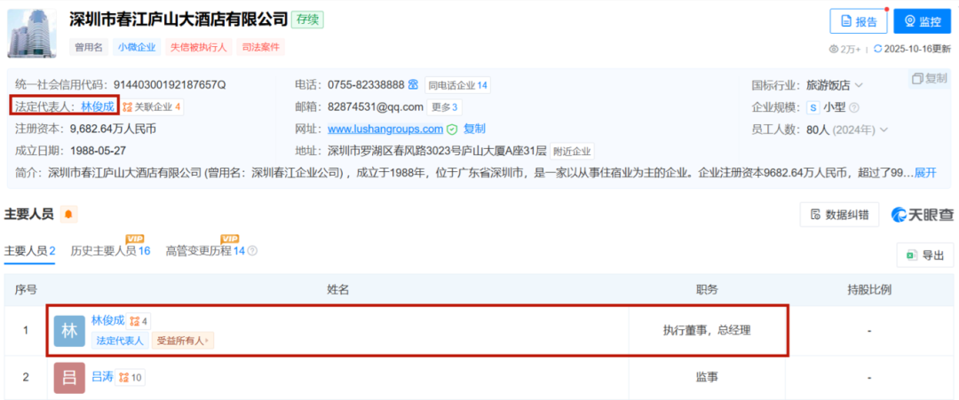 公开信息显示,春江庐山大酒店的法人代表及总经理,正是林俊成,也就是深圳庐山集团的董事长。