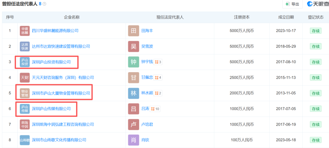 加入成都路桥前后,她曾担任多家深圳公司的高管和法定代表人,包括深圳市融汇鑫城实业有限公司(简称“融汇鑫城”)、深圳市富兴承实业有限公司(简称“富兴承”)、深圳庐山投资有限公司(简称“庐山投资”)、深圳市庐山大厦物业管理有限公司(简称”庐山大厦物业“)、深圳庐山传媒有限公司(简称“庐山传媒”)等。