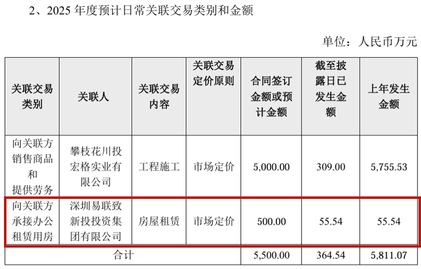 公告指出,公司预计在2025年度与关联方攀枝花川投宏格实业有限公司(简称“川投宏格”)、深圳易联致新投投资集团有限公司(简称“深圳易联致”)发生共计不超过5500万元的关联交易。