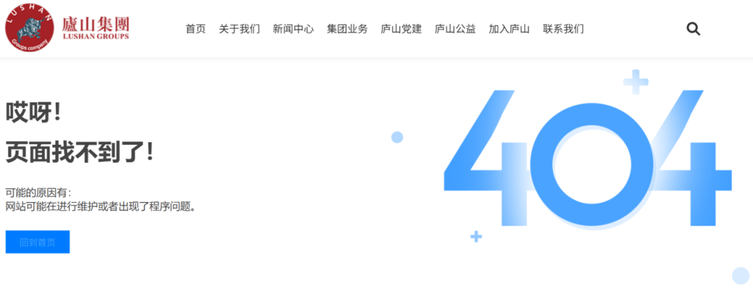 有意思的是,庐山集团官网的董事长致辞页面已无法打开,显示404。