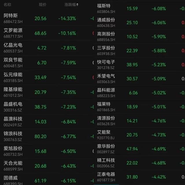 上述官方澄清披露后,光伏板块个股跌幅有所收窄,多晶硅期货主力合约强势反弹、日内由跌转涨。但截至收盘,光伏股仍大面积收跌。
