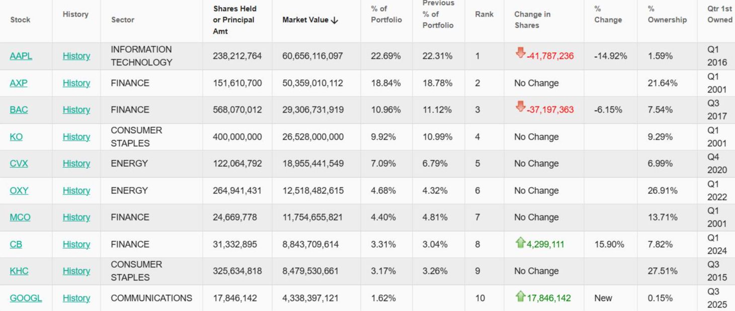 三季度伯克希尔的十大重仓股分别是: