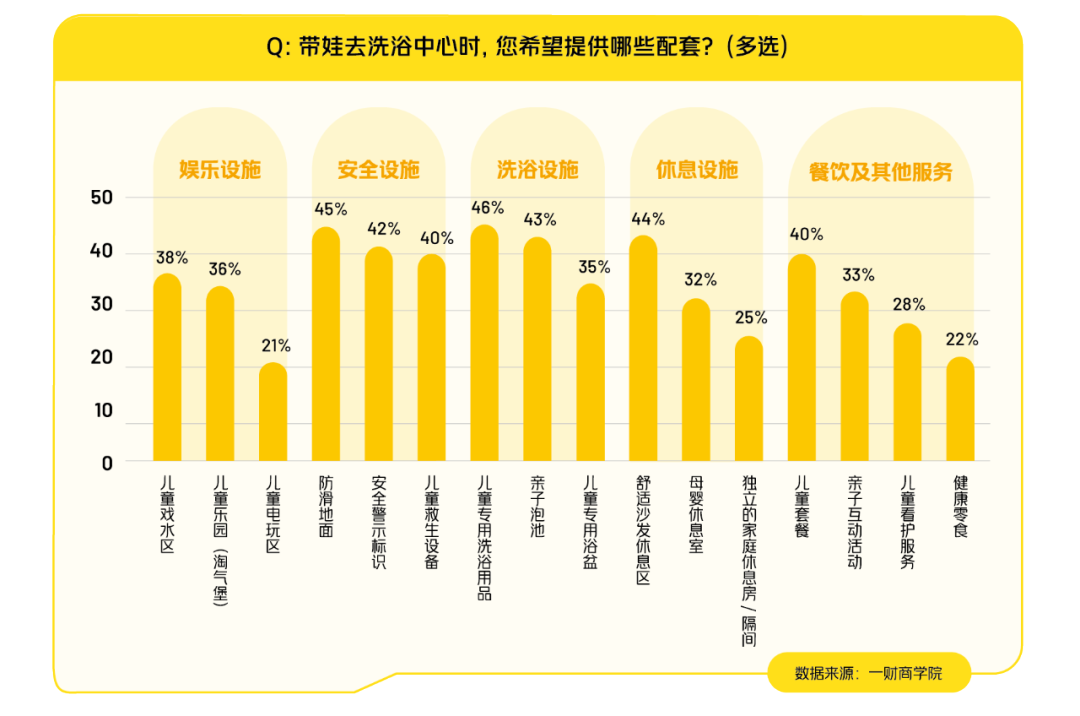 在配套服务关注度上,儿童安全设施、儿童洗浴设施、以及儿童餐饮及其他服务的关注度位居前三。洗浴中心的“封闭安全场景+一站式服务”让它成为家庭放松的首选场所,既能让孩子“放电”,也能让家长“回血”。