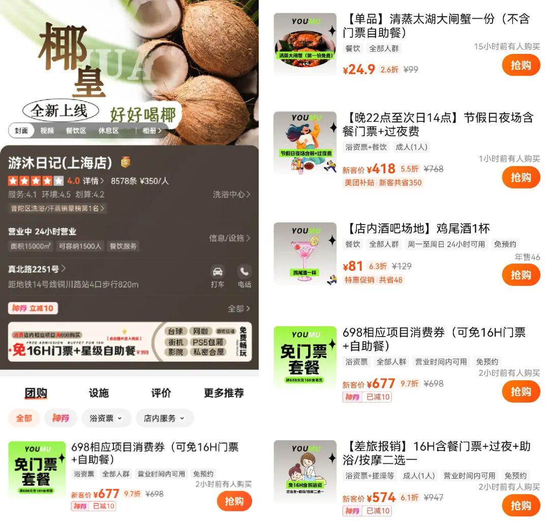 游沐日记是业态丰富的洗浴综合体,为进一步提升客单价与复购率,在单人与双人的浴资供给的基础上,精准挖掘“过夜”、“差旅”、“深夜娱乐”等需求,设计并上线了“夜猫子票”、“差旅票”等差异化团购产品。同时,上线“1元玩PS5”、“免费大闸蟹”、“大师鸡尾酒券”等高频低门槛供给,满足消费者多场景需求,激活二次消费。配合推出“增值服务抵扣浴资”的组合直接拉动客单价的提升。