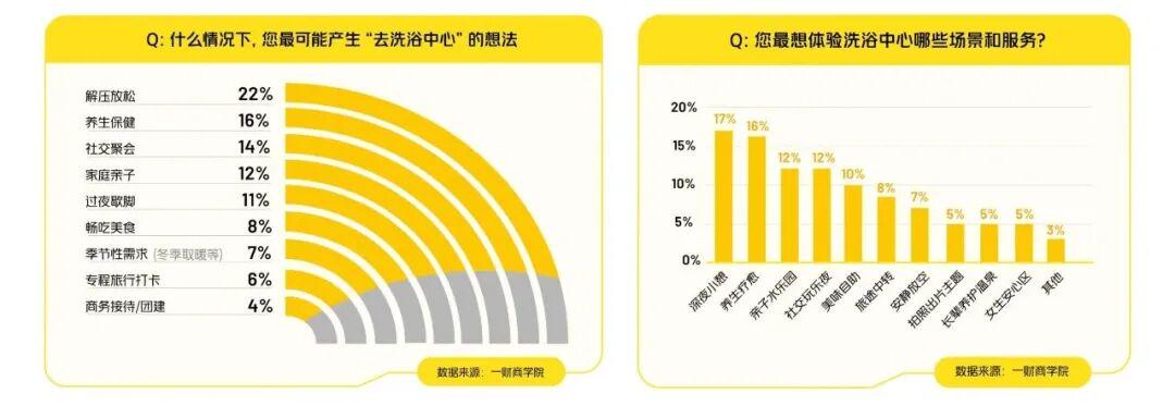 一财商学院调研显示,22%的消费者选择洗浴中心是为了“解压放松”,17%希望体验深夜小憩,16%追求养生疗愈。
