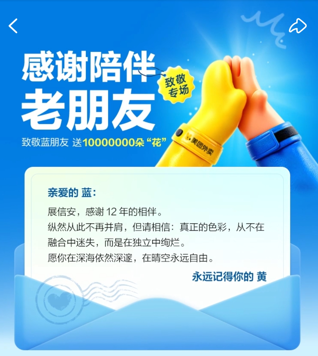 在致敬专场中,美团外卖的落款为“黄”,并对“亲爱的蓝”说:“感谢12年的相伴。纵然从此不再并肩,但请相信:真正的色彩,从不在融合中迷失,而是在独立中绚烂。”