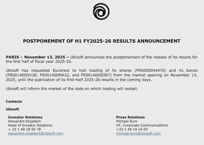 今天,原定是法国游戏公司育碧公布2025-2026财年上半年财报的日期,但遗憾的是计划赶不上变化,财报信息被育碧的另一则公告代替了: