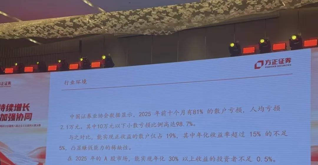 1、研报称,根据中国证券业协会,2025年前10个月有81%的散户亏损,人均亏损1.2万。其中10万元以下小散亏损比例高达98.7%。