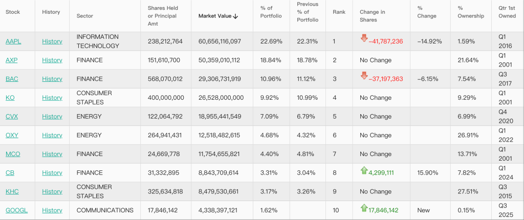 此外,美国银行也被减持,当季减持约3720万股,持股数环比下降6.15%,持仓市值减少19.2亿美元,持仓占比从二季度的11.12%略微降至10.96%,期末持仓市值约293亿元,仍是伯克希尔的第三大重仓股。