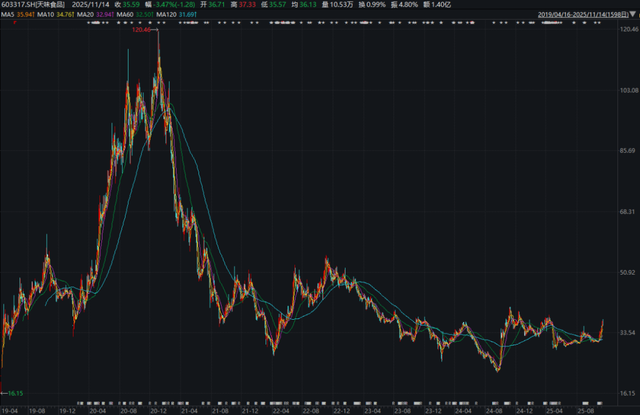 截至11月14日收盘,天味食品A股报收于13.08元/股,市值为139.3亿元。股价较2020年12月31日盘中触达的120.46元/股的历史最高点,已下挫89.14%。