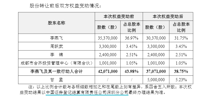 根据公司11月10日晚的公告,甘孟以每股24元的价格,从实控人李燕飞手中受让500万股股份。此次股份转让后,李燕飞及一致行动人持股比例降低至38.75%;甘孟在交易前未持有公司股份,协议转让后,持股占比为5.23%。