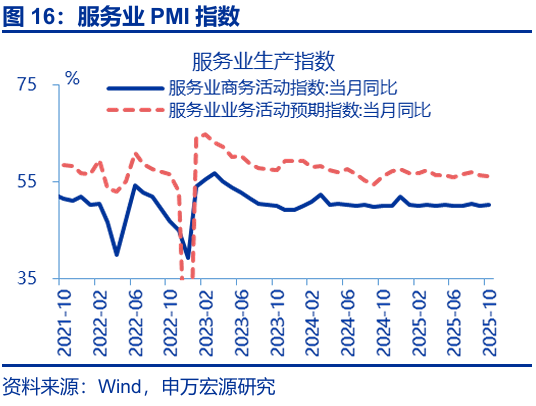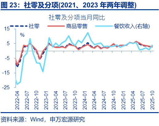 社零:电商促销前置但“以旧换新”商品消费退坡;工作日同比减少支撑服务消费韧性。10月,社会消费品零售总额同比增长2.9%,较上月小幅回落0.1个百分点,主要源于商品零售拖累。其中限额以上商品零售(-1.3pct至1.4%)下滑幅度较大,其中“以旧换新”典型商品如汽车(-8.2pct至-6.6%)、家电(-17.9pct至-14.6%)降幅较明显。不过,电商促销前置部分对冲上述影响,如通讯器材(+7pct至23.2%)、纺织服装(+1.6pct至6.3%)均有改善,也带动必需品消费如粮油食品(+2.8pct至9.1%)、中西药品(+1.7pct至3.6%)温和修复。服务消费表现稳健,10月工作日天数仅18天、同比较前月减少3天,考虑到国庆节后一周休假情况也居多,进一步放大了对服务消费的支撑,10月服务零售额累计同比较上月上行0.1个百分点至5.3%,餐饮收入当月同比较上个月改善2.9个百分点至3.8%。