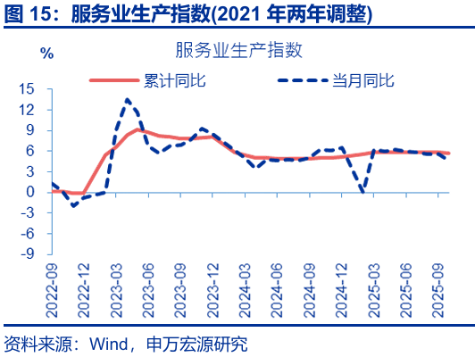 生产:工业生产走弱,服务业生产有所回落。10月,工业增加值当月同比较9月下行1.6pct至4.9%。其中制造业生产增速降幅较大,当月同比边际回落2.4pct至4.9%,采矿业(-1.9pct至4.5%)有所回落,公用事业大幅回升(+4.8pct至5.4%)。此外,服务业生产有所回落,10月服务业生产指数当月同比下行1.0pct至4.6%。