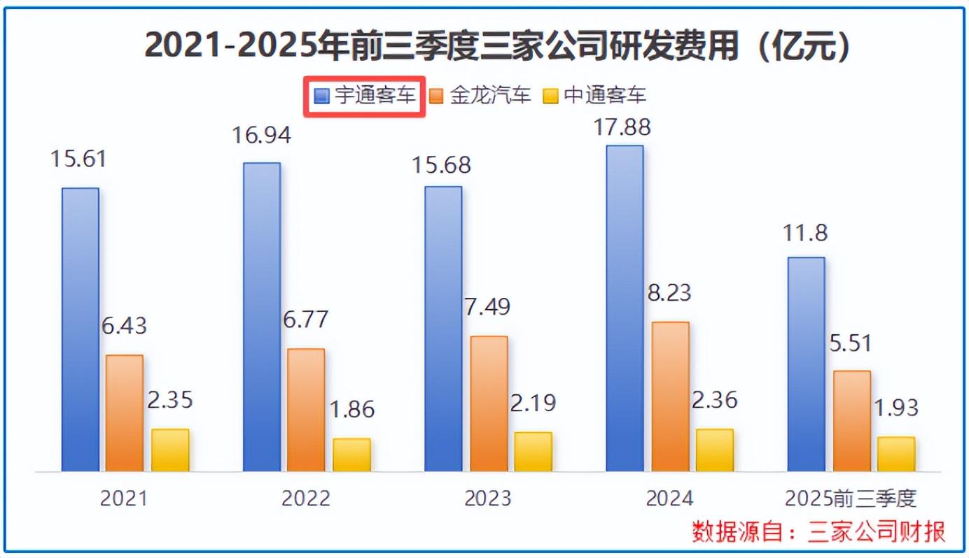 此后多年,公司在研发上持续加码,2021-2024年的研发费用基本稳定在16亿元左右,不仅高于金龙汽车、中通客车等主要同行,更将资金精准投入到核心技术突破上。