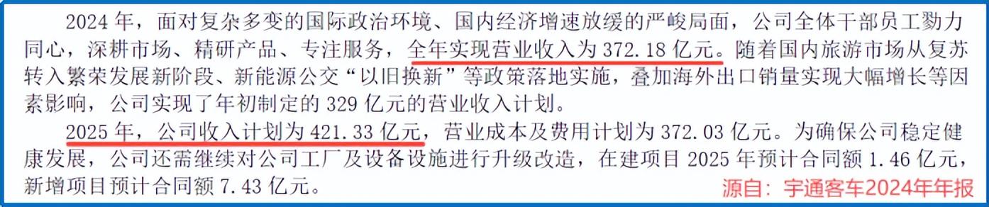 早在2024年年报中,宇通客车就清晰划出了2025年的收入目标:421.33亿元。