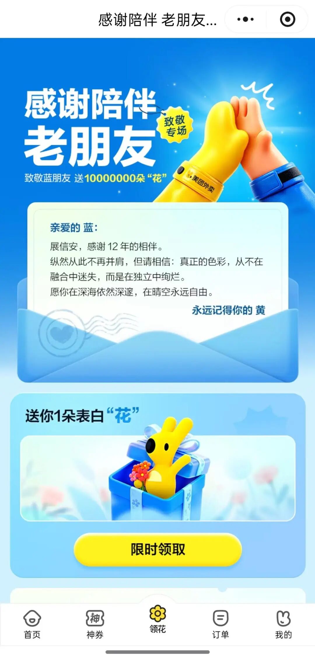 2025年11月14日,美团外卖APP上线一项活动——致敬蓝朋友。用户献花即可领券。活动页面附上一封致“蓝朋友”的信。