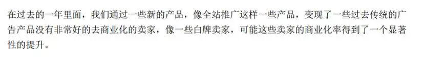 “在过去的一年里面,我们通过一些新的产品,像全站推广这样一些产品,变现了一些过去传统的广 告产品没有非常好的去商业化的卖家,像一些白牌卖家。”