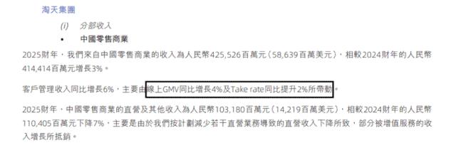 首先,在2025财年的财报中,淘天的GMV只在第75页呈现的一行小字:同比增长4%。