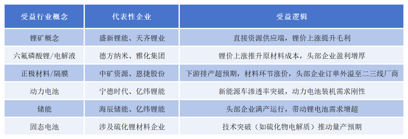 综合看来,锂矿涨价将直接利好锂矿概念板块、上游原材料(如六氟磷酸锂、电解液)、中游电池材料(如正极材料、隔膜)、下游动力电池和储能行业,同时固态电池技术突破可能带来新增长点。