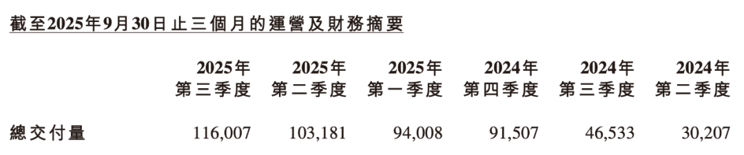 2025年第三季度汽车总交付量为116007辆,较2024年同期的46533辆增加149.3%。