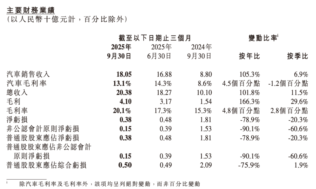 11月17日晚间,小鹏汽车公布的最新业绩数据显示,2025年Q3公司营收203.8亿元,同比增长101.8%;季度毛利率为20.1%,较2024年同期上升4.8个百分点;归属于上市公司股东的净亏损3.8亿元,上年同期净亏损18.1亿元。
