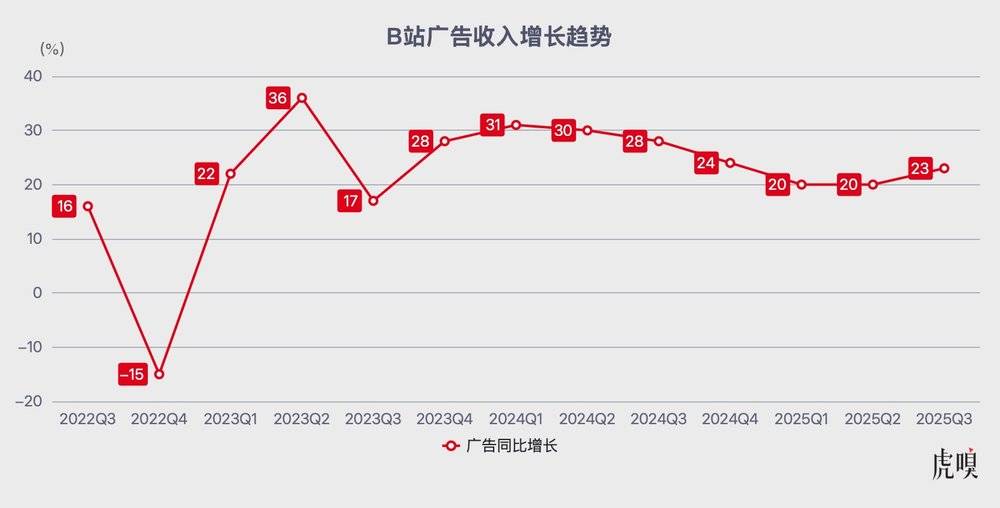 这一判断,从季度表现亮眼的广告业务中得到了验证——2025Q3 B 站广告收入同比增长 23% 至 25.7 亿元,主要得益于广告产品供应优化与广告效益提升。