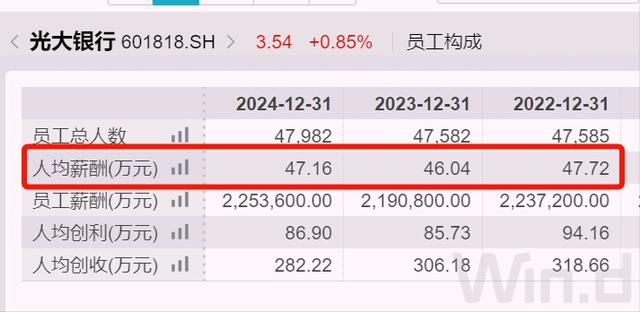至2024年末,光大银行职工数量接近4.8万人,去年人均创利近87万元,人均税前薪酬47万元,比2023年增加1万元。