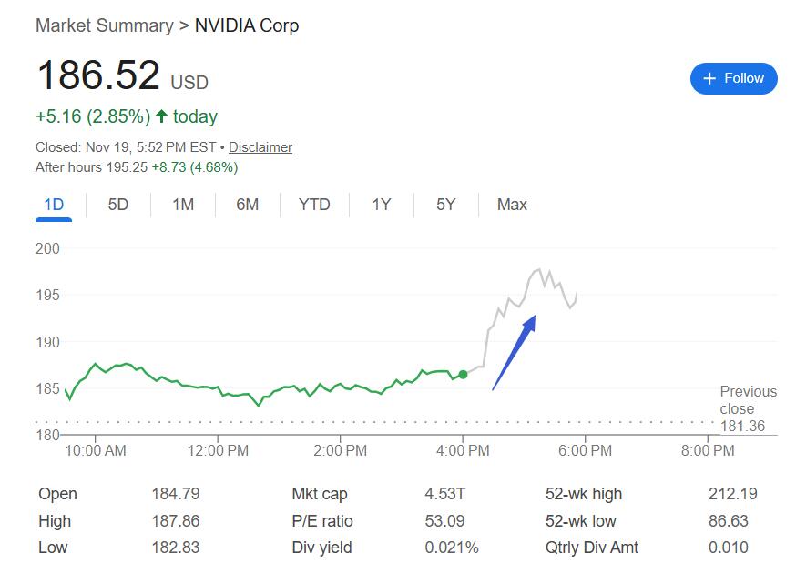 Wedbush证券的分析师Matt Bryson指出,英伟达实现了此前投资者担忧无法达到的两个目标,一是预测总营收将超高600亿美元,二是预计毛利率将达到75%左右。