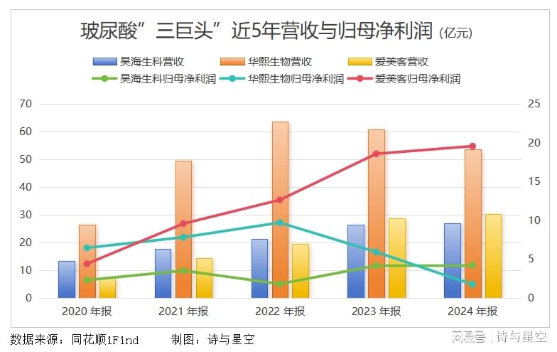 目前我国玻尿酸行业由华熙生物[688363.SH]、爱美客[300896.SZ]、昊海生科[688366.SH]三大巨头主导,但近年来面临重组胶原蛋白等新成分的冲击,整体业绩承压。