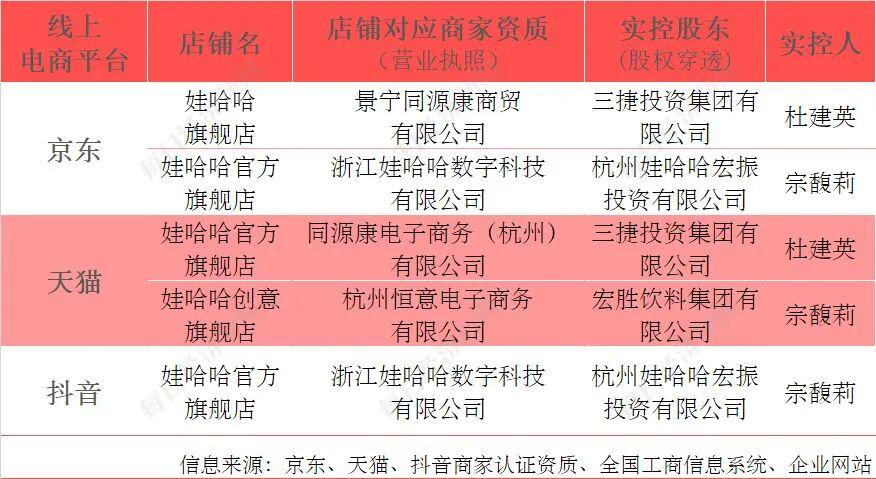 目前,天猫、京东、抖音平台上娃哈哈的官方店铺均统一为“娃哈哈官方旗舰店”,其官方旗舰店对应的商家资质统一为杭州恒意电子商务有限公司,股权穿透后的实控股东为宏胜饮料集团有限公司,实控人为宗馥莉。