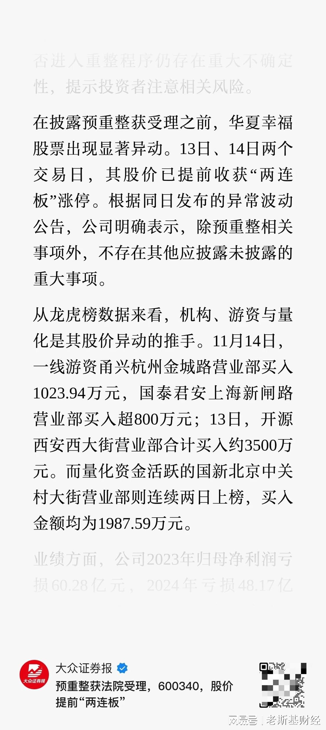 《大众证券报》报道,机构、游资与量化是华夏幸福公告前股价异动的推手: