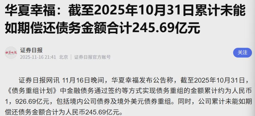 截至2025年10月31日,华夏幸福累计未能如期偿还债务金额合计245.69亿。