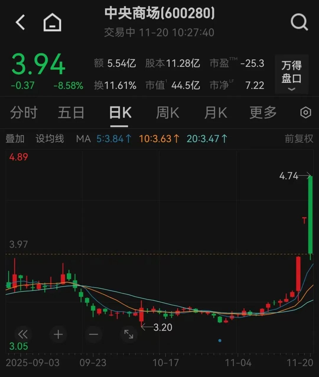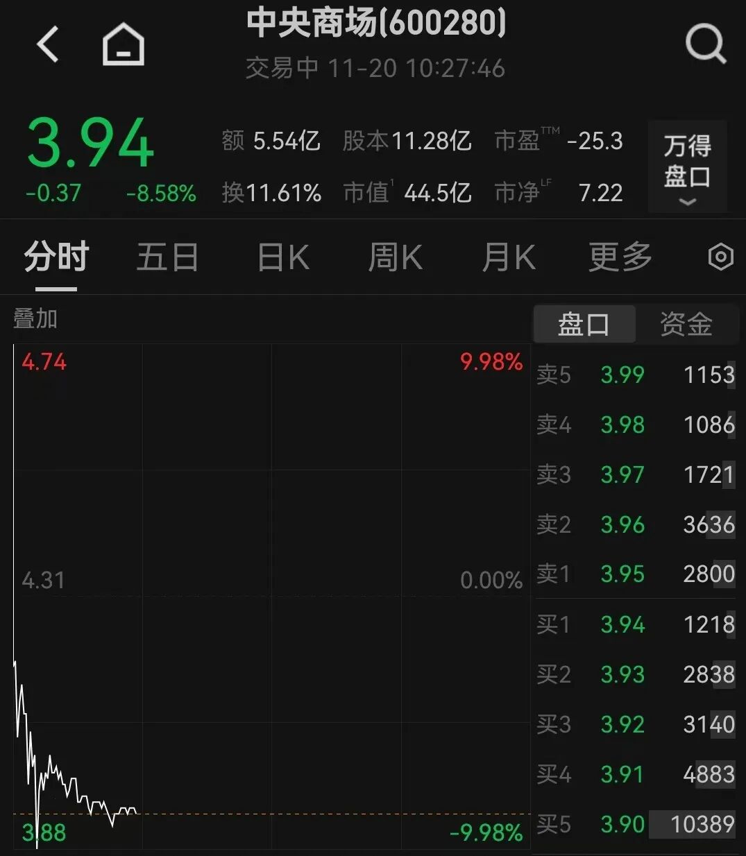 11月20日,中央商场开盘涨停,随后股价快速跳水,盘中触及跌停,上演“天地板”,截至发稿,跌幅超8%,成交额超5亿元。
