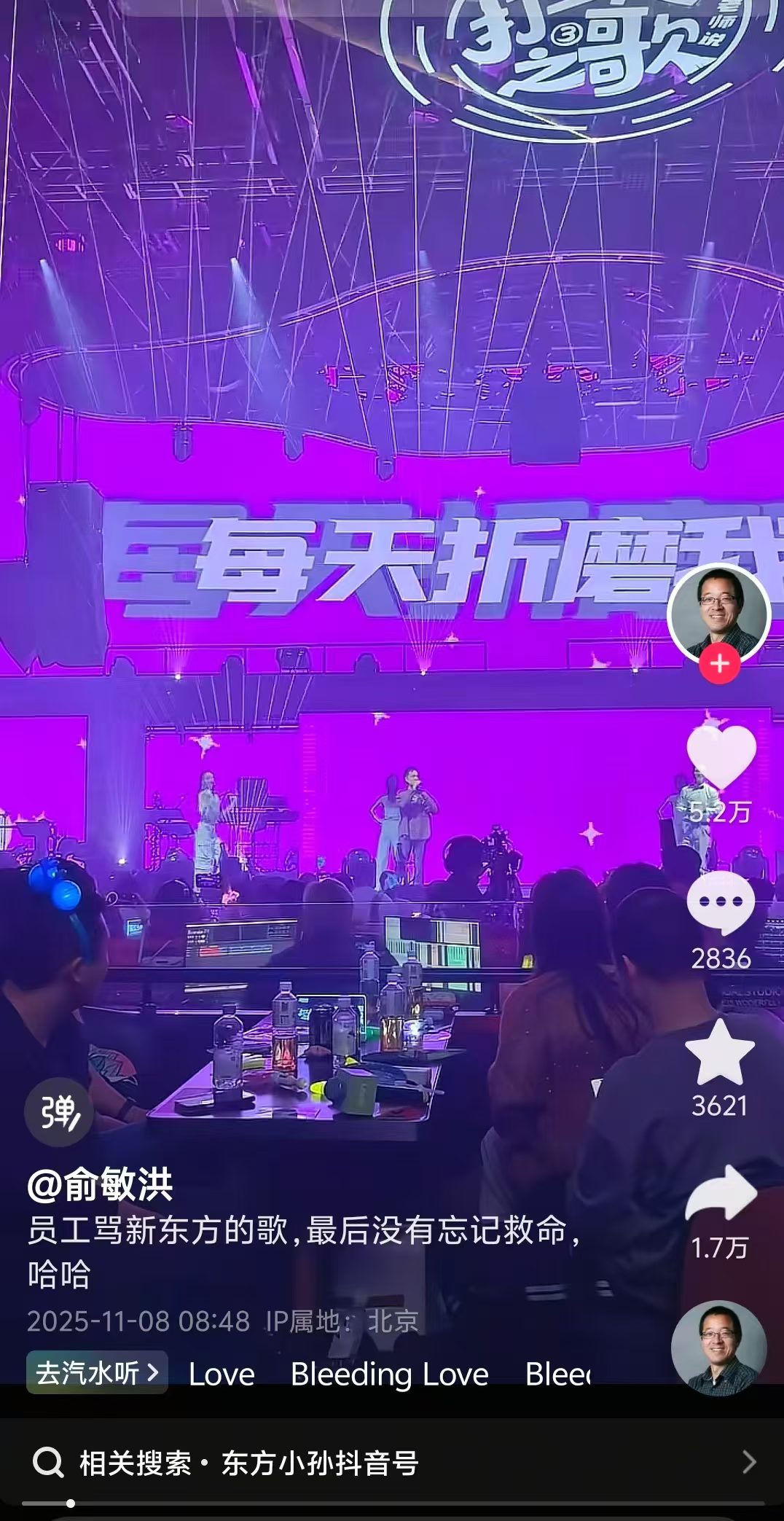 新东方的员工似乎个个胆大包天。2025年11月9日,新东方员工创作的吐槽公司歌曲《打工人之歌》被俞敏洪在抖音上转发。该歌曲疑似改编自TFBOYS的歌曲《青春修炼手册》,歌词满是打工人的共鸣:“日报、周报每天折磨我”“过节收到礼盒,不用想又是甄选的”“业绩导向、续费为王”“休假时钉钉还在响”……