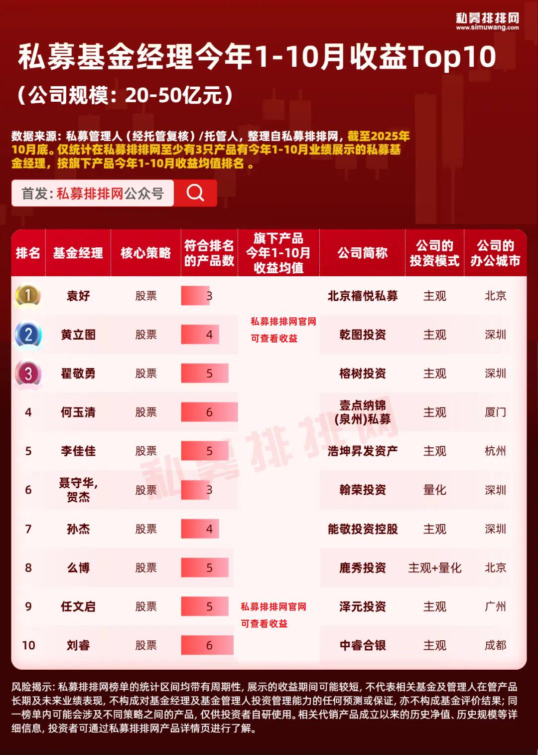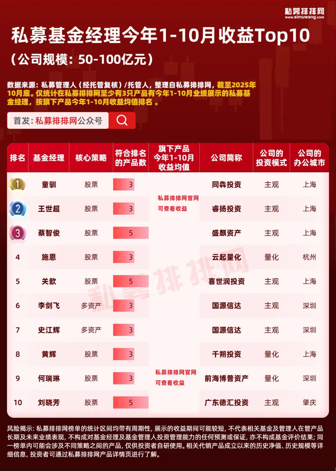 截至2025年10月底,来自百亿私募且“在私募排排网至少有3只私募产品有今年1-10月业绩展示”的基金经理共有77位,今年1-10月收益前10强的上榜“门槛”超***%。