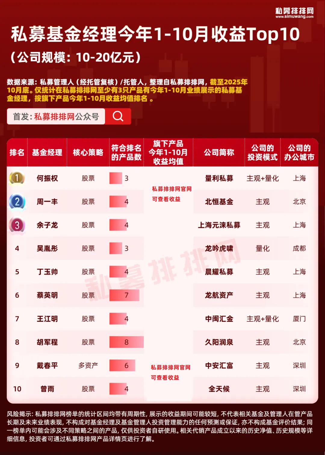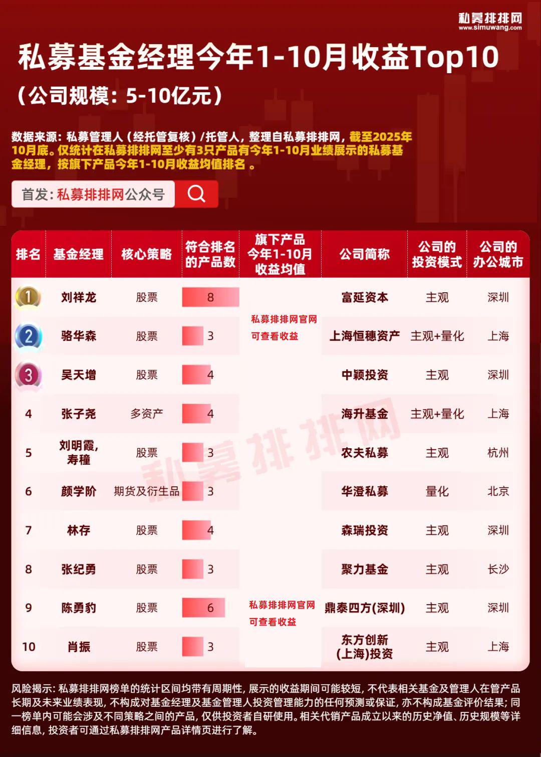 来自5-10亿规模私募且“在私募排排网至少有3只私募产品有业绩展示”的基金经理共有95位,今年1-10月收益前10强的上榜“门槛”超***%。