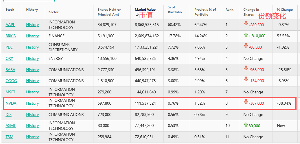 其中,段永平对英伟达的持仓大幅减少38.04%,减持后占比仅0.76%。