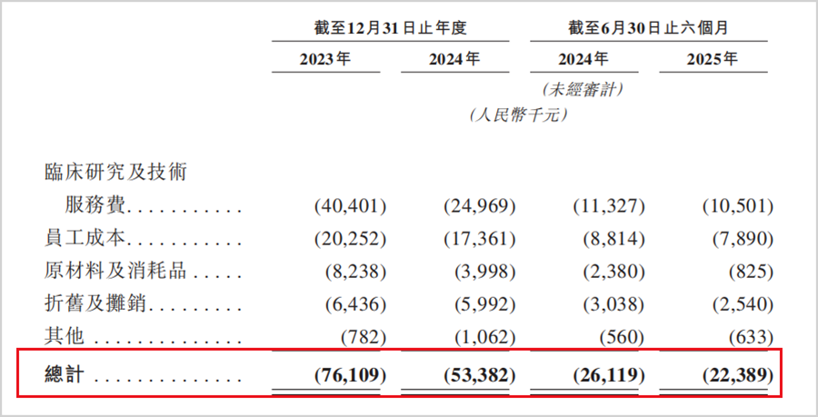 更值得关注的是,作为一家需要长期高强度投入的Biotech公司,公司的研发投入近年来呈现显著收缩趋势。报告期内,研发费用从2023年的0.76亿元降至2024年的0.53亿元,2025年上半年进一步缩减至0.22亿元,同比降幅超15%。