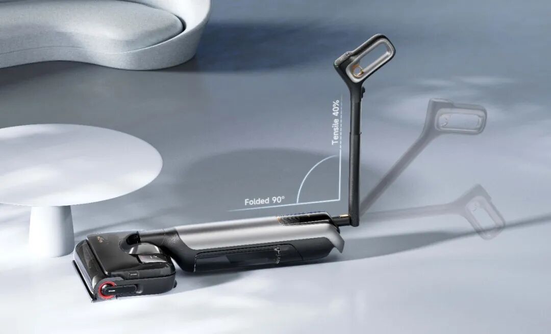 具体而言,这款行业首创的折叠手柄支持0-90°自由调节。清洁低矮空间时,用户单手扣动按钮即可一键折叠,无需弯腰即可深入床底。面对床边等狭窄区域,手柄同样灵活弯曲,轻松探入。整体手持高度加长27%,进一步优化了直立清洁的舒适度。