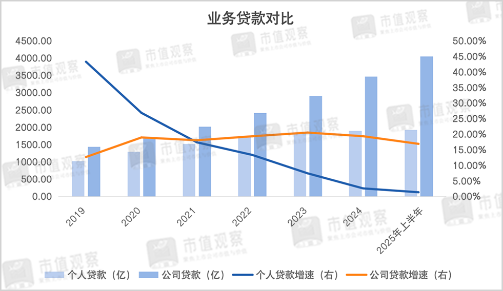 在零售战略的驱动之下,长沙银行的零售贷款规模快速增长,2019年增速达43.24%,此后便不断滑落,到2025年上半年仅增长了1.33%至1920.36亿,期间贷款占比也由39.18%降至31.86%。