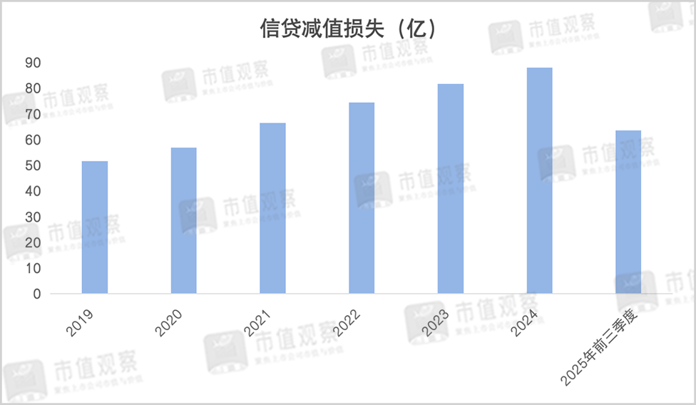 近年来,长沙银行的信贷减值损失持续攀升,自2019年至2024年间从51.67亿增长到88.05亿,持续高于净利润。2025年前三季度计提了63.58亿,虽然同比下降了1.78%,依旧维持在较高水平。