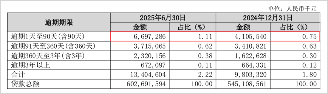 其中,长沙银行1天至90天的逾期贷款增长最快,从2024年底的41.06亿增长到上半年的66.97亿,说明该行短期内的资产质量压力仍在加大。