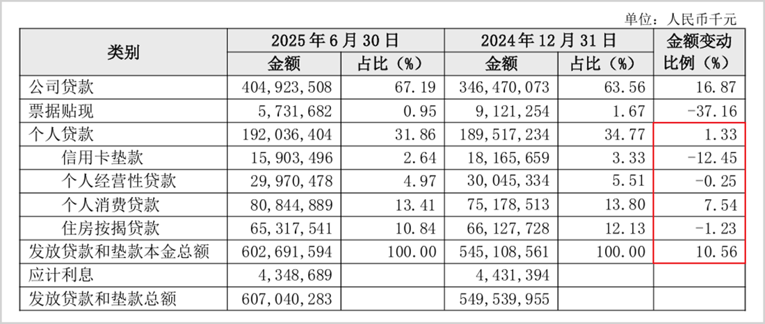 2025年上半年,长沙银行的四大零售业务中信用卡、个人经营贷和个人按揭业务均出现了负增长,其中信用卡贷款下滑更为明显,环比2024年底下降了12.45%至159.03亿。真正支撑零售板块增长的只有个人消费贷,但增速只有个位数。