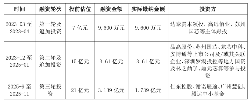 目前,江原科技已完成第一轮、第二轮、第三轮融资,除品高股份外,其他投资方还包括安博通、苏州国芯、龙芯中科、仁东控股等上市公司及/或其关联企业作为产业投资方,达泰资本、普华资本等战略投资方,深圳罗湖投控等地方国资产投。第三轮融资完成于2025年9月至11月,投前估值为21亿元,融资金额为3.139亿元,已实缴1.739亿元。