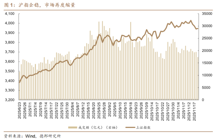 银行护盘明显,地产盘中活跃。伴随盘前英伟达业绩公布超预期,市场对AI泡沫的忧虑有所缓解,带动整体股市高开。但国内市场当前仍相对偏弱,叠加今日LPR维持不变,市场宽松预期有所受限,带动整体市场呈现高开低走的格局。盘面上,建筑、地产、银行等板块相对强势。消息面上,近期多地持续出台稳楼市政策。例如,11月19日,佛山市八部门联合印发《关于进一步促进房地产市场平稳健康发展的若干措施的通知》,推出12条楼市新政。其中包括加大存量土地“收调供”力度、严控新增商服用地供应规模和商住用地配比、加大住房公积金贷款购房支持力度等。市场预期随着“十五五”临近,围绕提升住房消费的稳楼市政策仍有继续加码的空间。