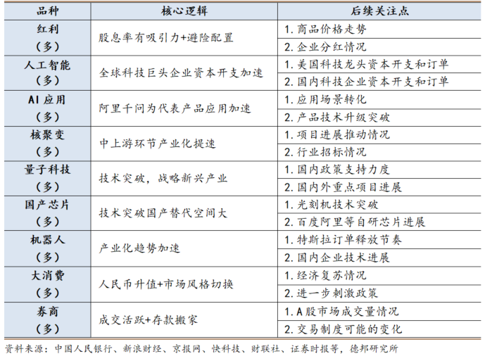 商品方面,我们认为国内反内卷相关板块如碳酸锂、双硅供给端政策或逐步落地,预期强化下或仍有上行空间;美联储当前表态下贵金属预期或有所转弱,建议关注后续美国通胀数据,若12月非农数据疲软或地缘风险升温,贵金属仍有上行机会。