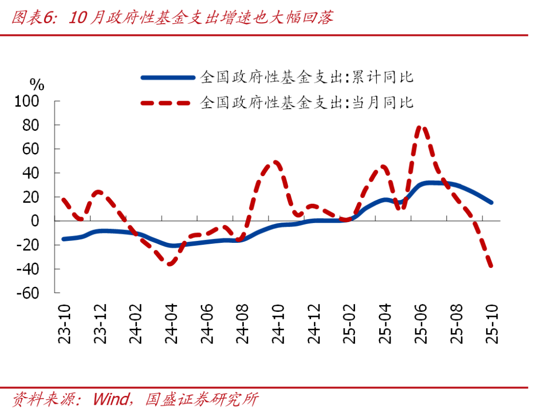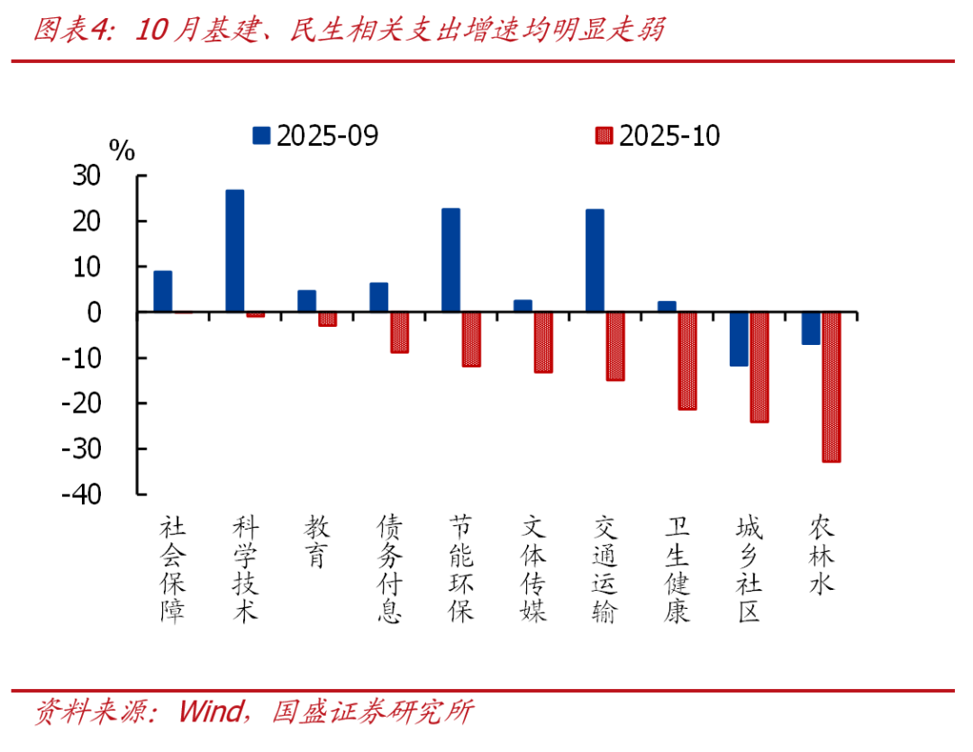 >一般财政支出增速放缓、支出节奏也慢于季节性,央地支出增速均放缓,基建、民生相关支出增速均大幅回落。10月一般财政支出1.78万亿,同比-9.8%、较上月回落12.9个百分点。支出进度来看,10月一般财政支出占全年比重为6%、明显低于季节性(近三年同期均值为6.5%),1-10月累计支出进度为76%、也低于季节性(近三年同期均值为78.5%)。结构上看,地方财政支出同比-11.9%、较上月大幅回落14.9个百分点,是主要拖累,中央财政支出同比-1.0%、也较上月回落4.2个百分点。投向上看,基建相关支出同比-26.7%、较上月回落23.6个百分点,其中城乡社区事务、农林水、交通运输相关支出增速均大幅回落;民生方面,教育、社会保障、卫生健康相关支出增速也出现明显回落。