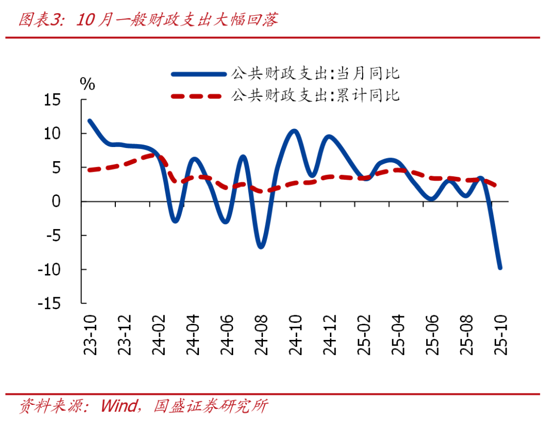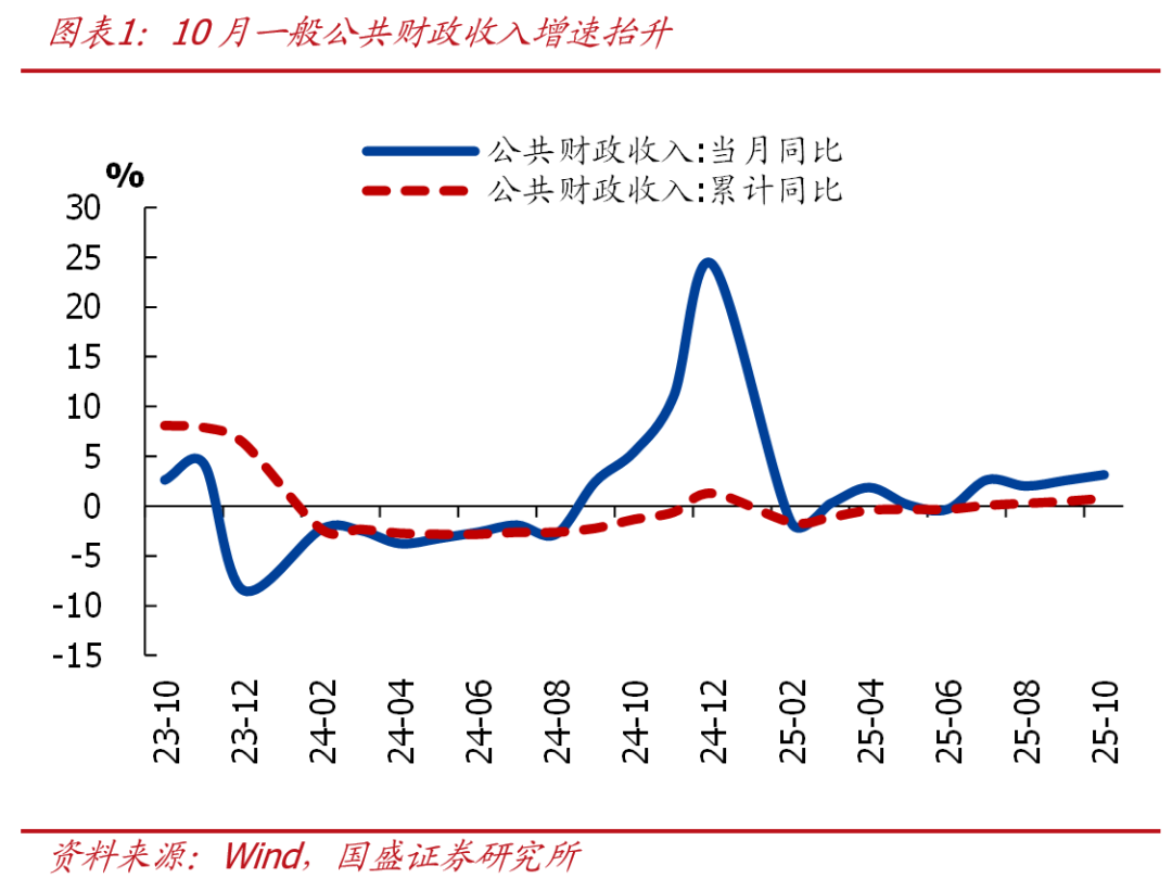 事件:2025年1-10月一般财政收入累计18.65万亿,同比0.8%(1-9月同比0.5%);10月一般财政收入2.26万亿,同比3.16%(9月同比2.58%)。1-10月一般财政支出累计22.58万亿,同比2%(1-9月同比3.1%);10月一般财政支出1.78万亿,同比-9.78%(9月同比3.08%)。 核心观点:10月财政收支分化明显,主要有 4 点关注:一是税收收入延续高增,可能与物价改善推升名义变量表现等有关;二是国有资产盘活较难延续,非税收入增速创近 5 年新低;三是一般财政支出增速明显回落、支出进度也偏慢,后续有两种可能,年底加快支出进度或者结转至明年支出,将直接影响明年财政支出力度,关注最终预算执行情况;四是土地出让收入再度负增,土地财政仍承压。往后看,财政的当务之急仍是推动现有政策落地,形成更多实物工作量。维持年度策略报告的观点: 2026 年政策应会偏积极、偏扩张,优化“投资于物”、更注重“投资于人”,节奏上有望前置发力;预计 2026 年财政扩张力度与 2025 年大体相当,赤字率 4% 左右、专项债 5 万亿、特别国债 2 万亿左右,对应 2026 年全口径财政支出规模有望达 43 万亿、较 2025 年多增 1.13 万亿。