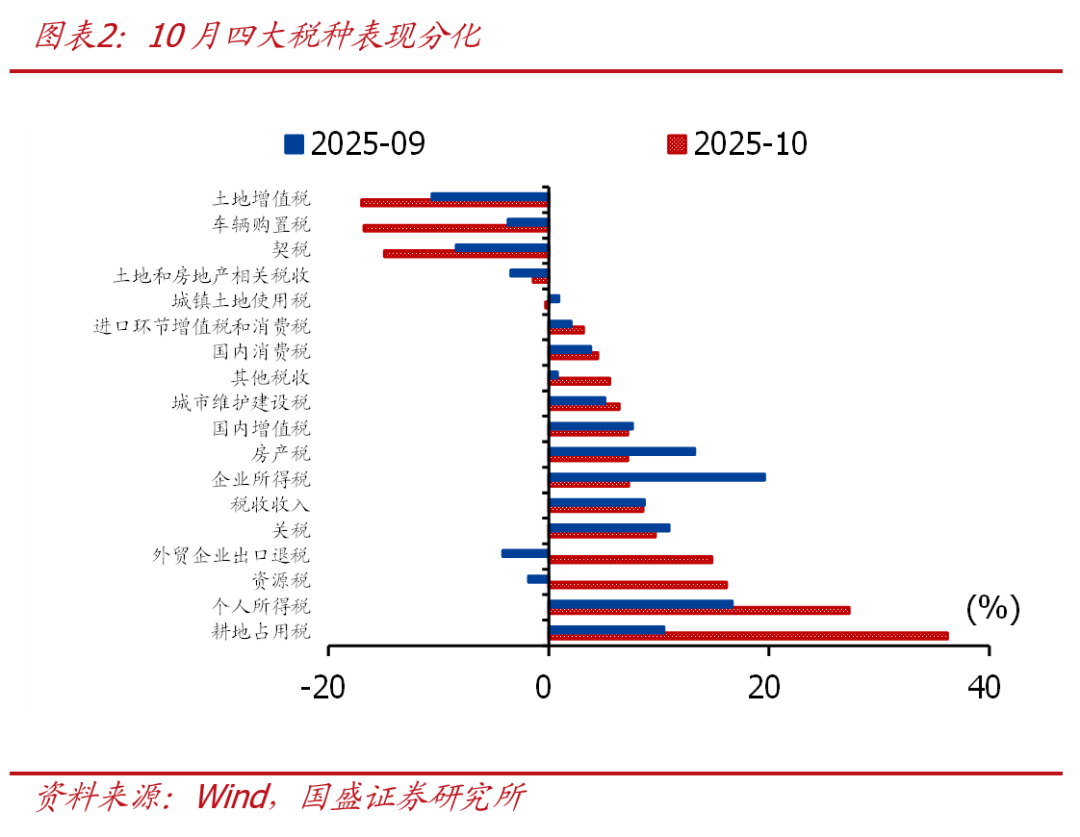 1、当月看,10月一般财政收入增速抬升,税收收入延续高增是主要支撑,四大税种收入表现分化,土地和房地产相关税收增速降幅进一步收窄,非税收入增速创近5年新低。一般财政支出增速放缓、支出节奏也慢于季节性,央地支出增速均放缓,基建、民生相关支出增速均大幅回落。10月政府性基金收入增速再度转负,土地出让收入降幅走扩;专项债发行完毕、叠加基数走高,政府性基金支出明显放缓。