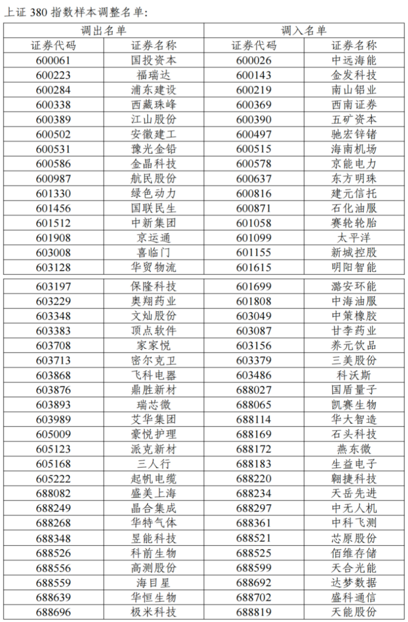 上证380指数样本股调入中远海能、金发科技、南山铝业、西南证券、五矿资本、驰宏锌锗、海南机场、京能电力、东方明珠、建元信托、石化油服等38只个股,调出国投资本、福瑞达、浦东建设、西藏珠峰、江山股份、安徽建工、豫光金铅、金晶科技、航民股份和绿色动力等38只个股。